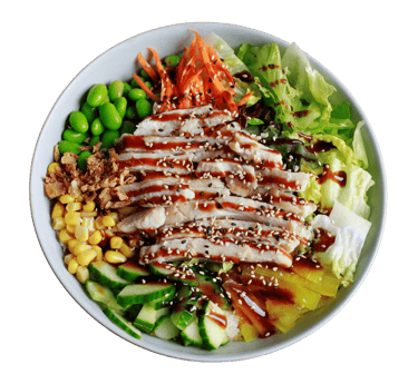 Chicken breast, mixed greens, cucumber, edamame, carrot salad, corn, oshinko