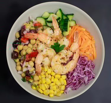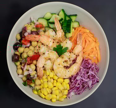 Grilled shrimps, chickpea salad, cucumber, carrot salad, corn, purple cabbage